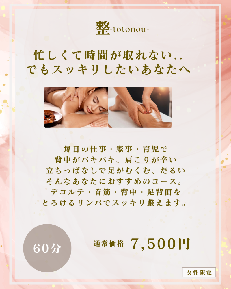 ◎冷え防止あったかコース 冷えのきつい方、温める力の弱い方 生理、妊娠、婦人病全般に。 ◎ストレス解消すっきりコース すっきり感を味わいたい方、ストレスがたまり気味の方、気持ちが晴れない方に。 ◎美肌コース 体質に関係なく、リラックスとともに 美容面を重視したい方に。 ◎むくみ改善コース 特に下半身の浮腫が 気になる方におすすめです |